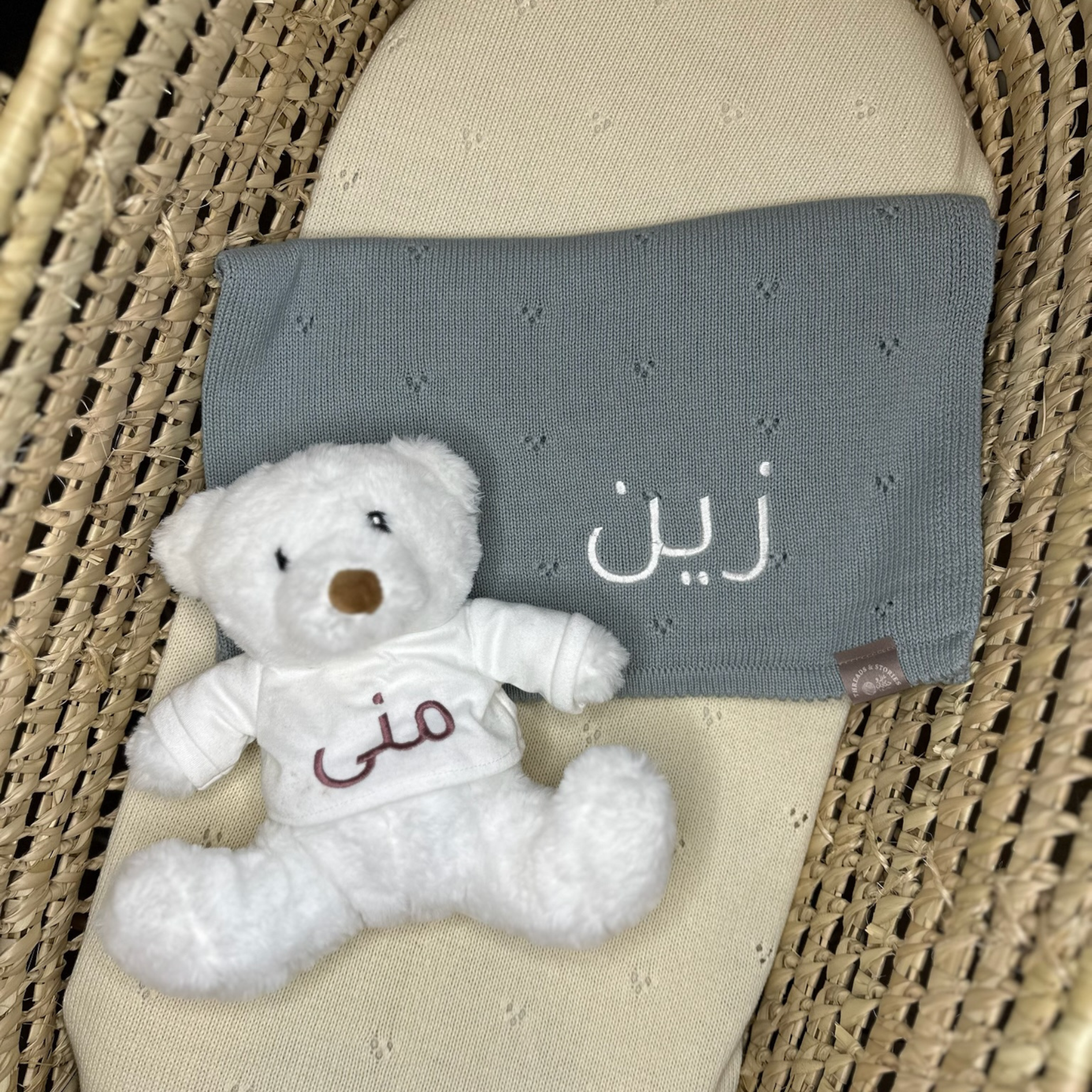 Bundle Includes: x1 Pointelle Baby Knit Blanket and x1 Noor Bear